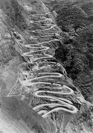 Convoys ascending a famous 21-curve stretch along the Burma Road (U.S. Army photograph)